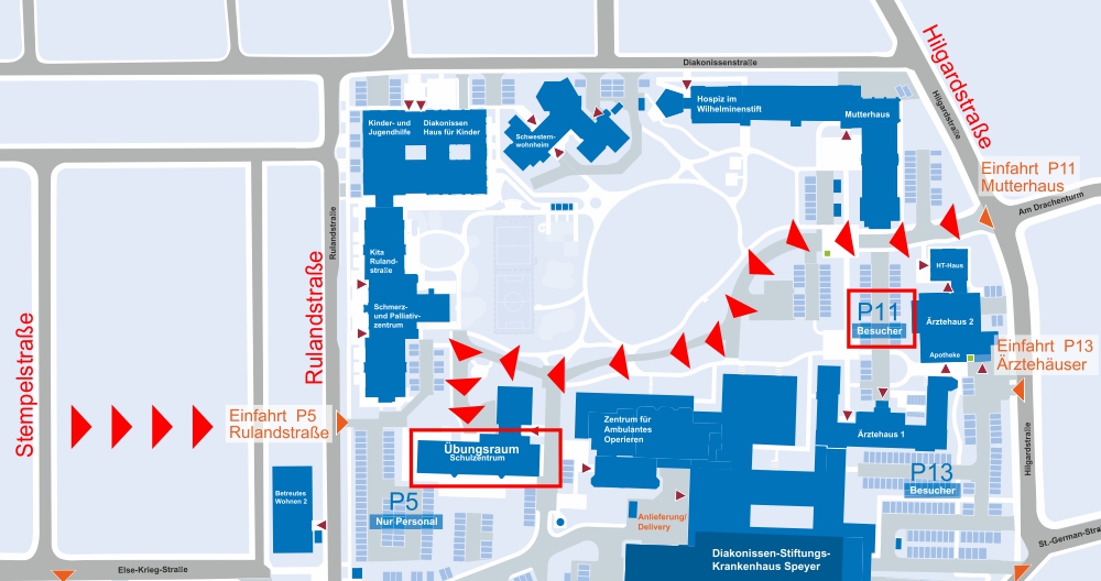 Der einfachste Zugang geht von der Rulandstraße aus: am Parkplatz P5 auf das Krankenhausgelände gehen, immer geradeaus und ein wenig rechts halten, einige Stufen hinunter, der Eingang zum Übungsraum ist rechts.